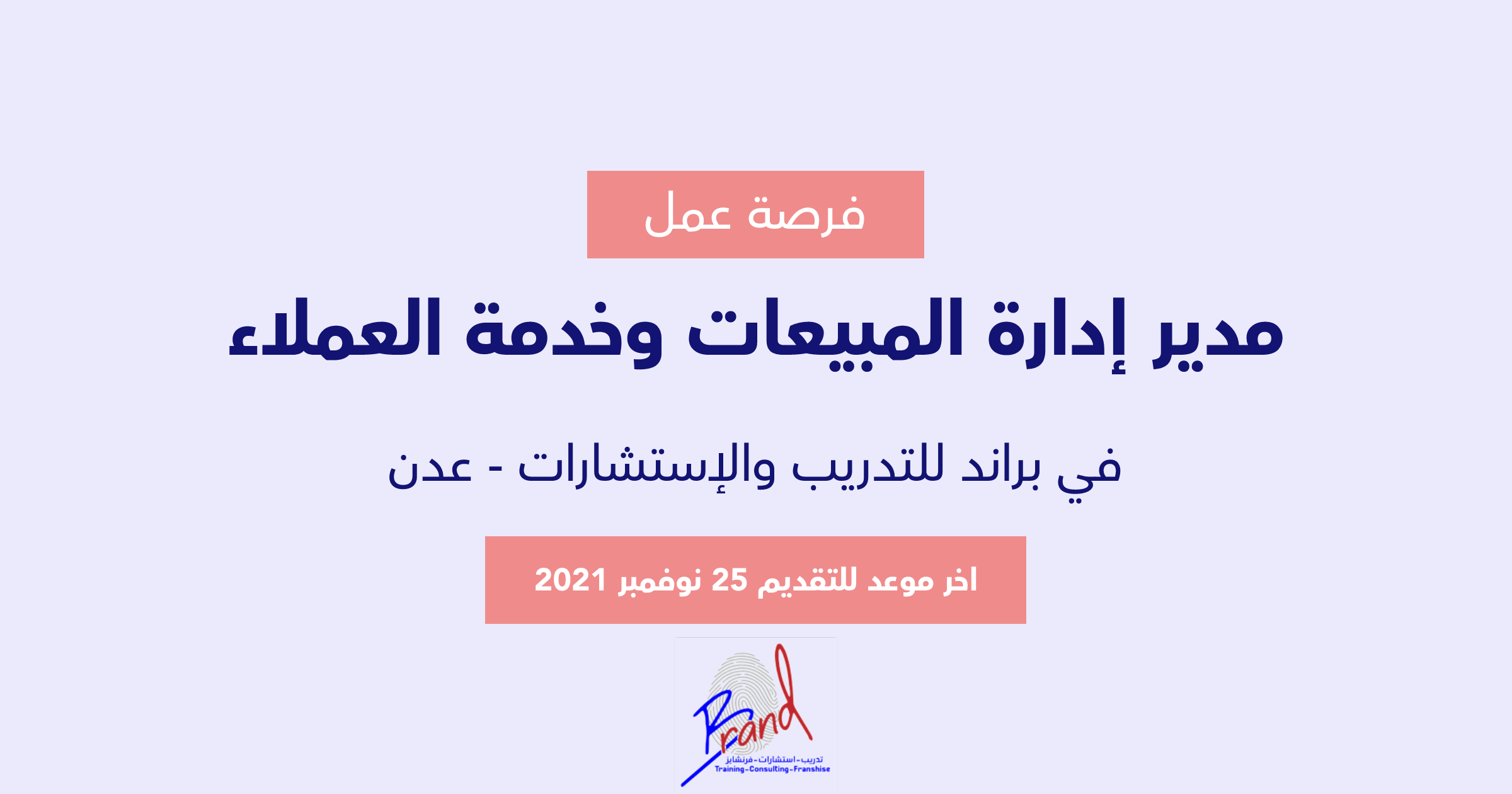 تعلن براند للتدريب والاستشارات عن حاجتها لمدير إدارة المبيعات وخدمة العملاء في عدن وبحسب البيانات التالية: